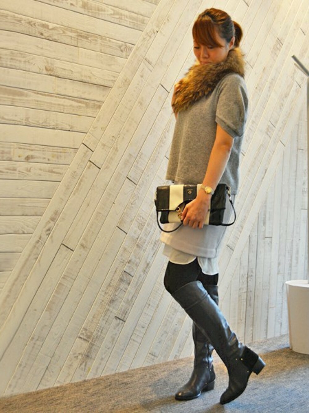 ニットワンピに、ファーとロングブーツで秋の雰囲気をプラス。 ショルダーにもなる2WAYクラッチのバイカラーがポイントです。