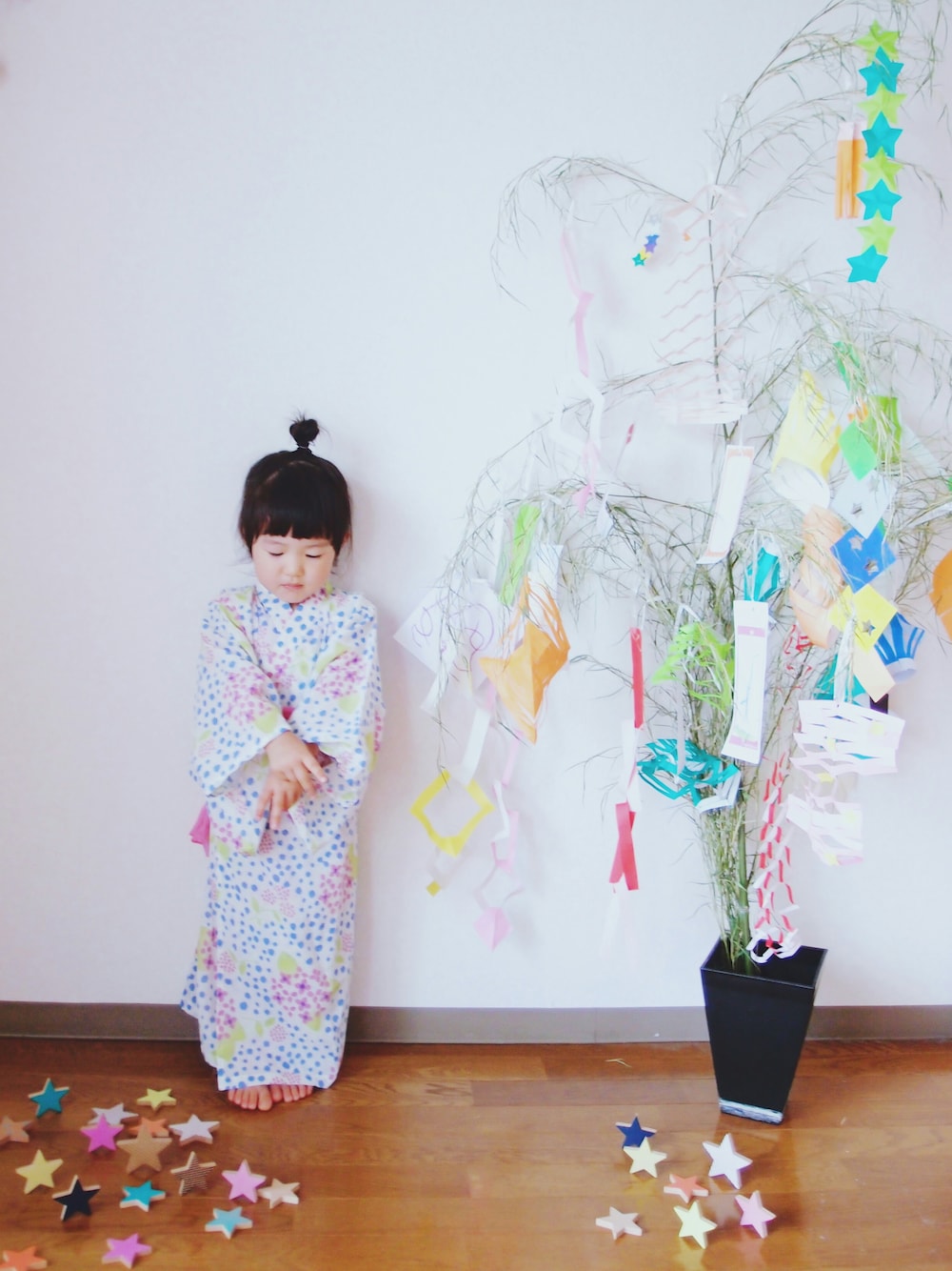 セパレートタイプの浴衣 着せやすく はだけにくくて良いです◎ 今週からはじまる土曜夜市🌛 新調した浴衣を着せて行こうと たのしみにしていたのに ‥ 雨、雨、雨 🌂 せっかくなので きのうおともだちと飾りつけした笹で 七夕っぽく撮ってみました🎋 ムスメは でーんでんむーしむし かーたつむりー🐌を歌ってます♩ 手がどっちも✌になってるよ。 笹の葉は実家の祖母がとってきてくれました☺