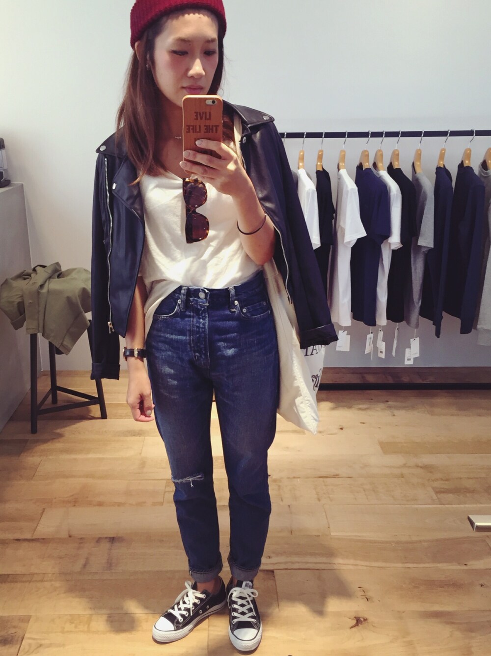 旦那のお店がついに明日open! お店に寄ったらいい感じの鏡があったので、 鏡撮り♡ またまた定番アイテムの 定番コーデですが、 頭は差し色に赤のニット帽 かぶってました(ー▽ー) IG→yankuri5 プロフィールからも飛べます!
