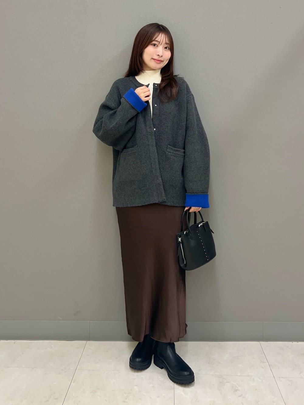 人気のバイカラーニットコート🩵 リブハイ×サテンスカートでキレイめに合わせてみました◎ 是非店頭でご覧下さい!