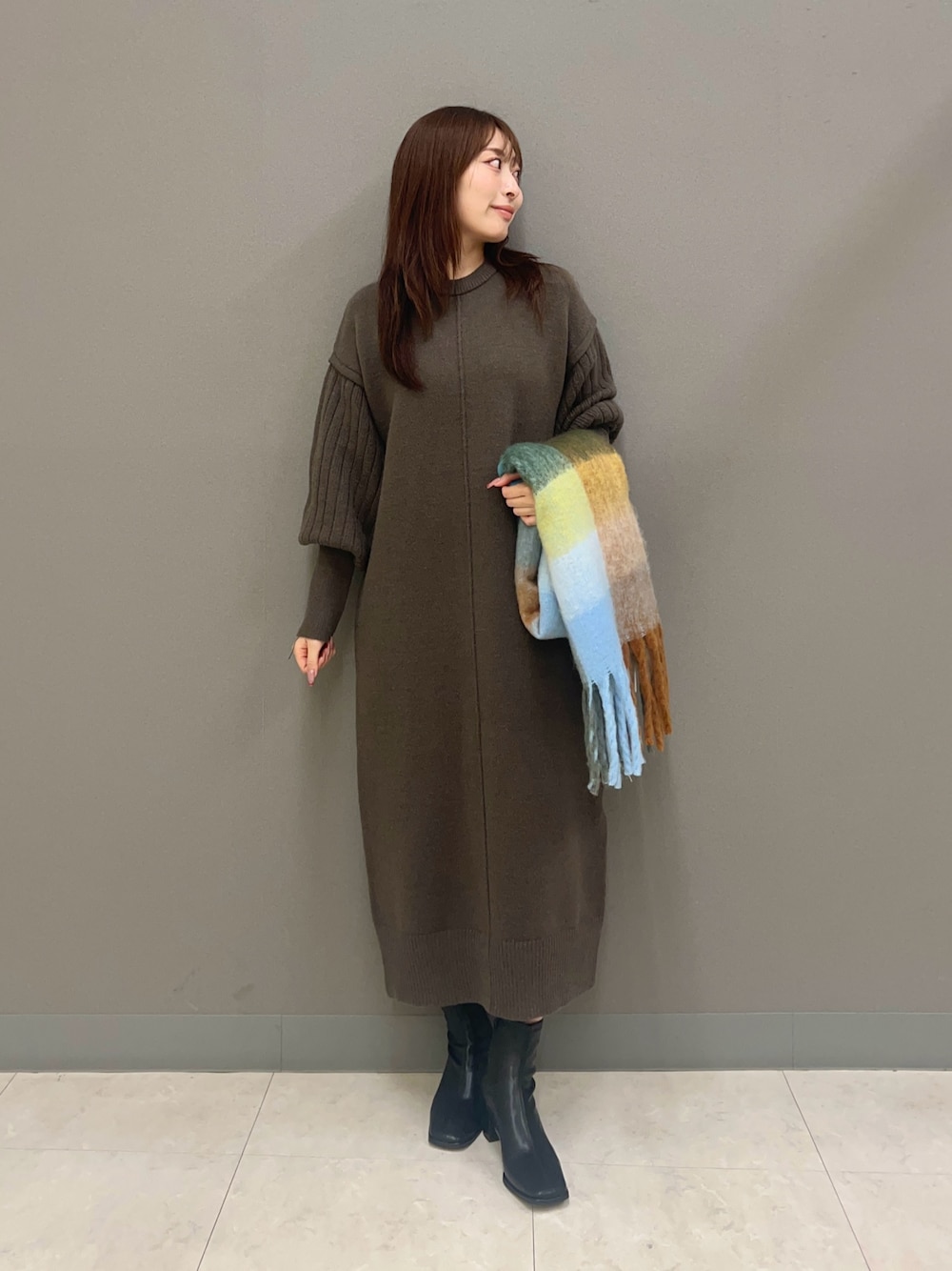 ヤノアミ(SENSE OF PLACE ジョイナス横浜)のワンピース「センターシームサムホールニットワンピース」を使ったコーディネート