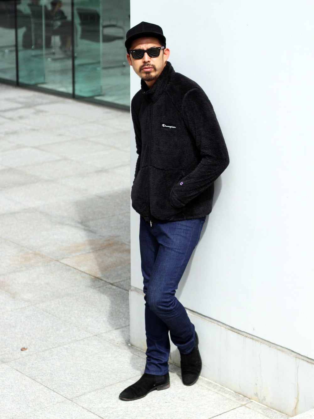 tk.TAKEO KIKUCHIがChampionに別注したフリーススタンドジャケットをメインにしたクリーンカジュアルスタイル。カジュアルな印象のフリースジャケットをサイジング、小物使いでモード感を演出。