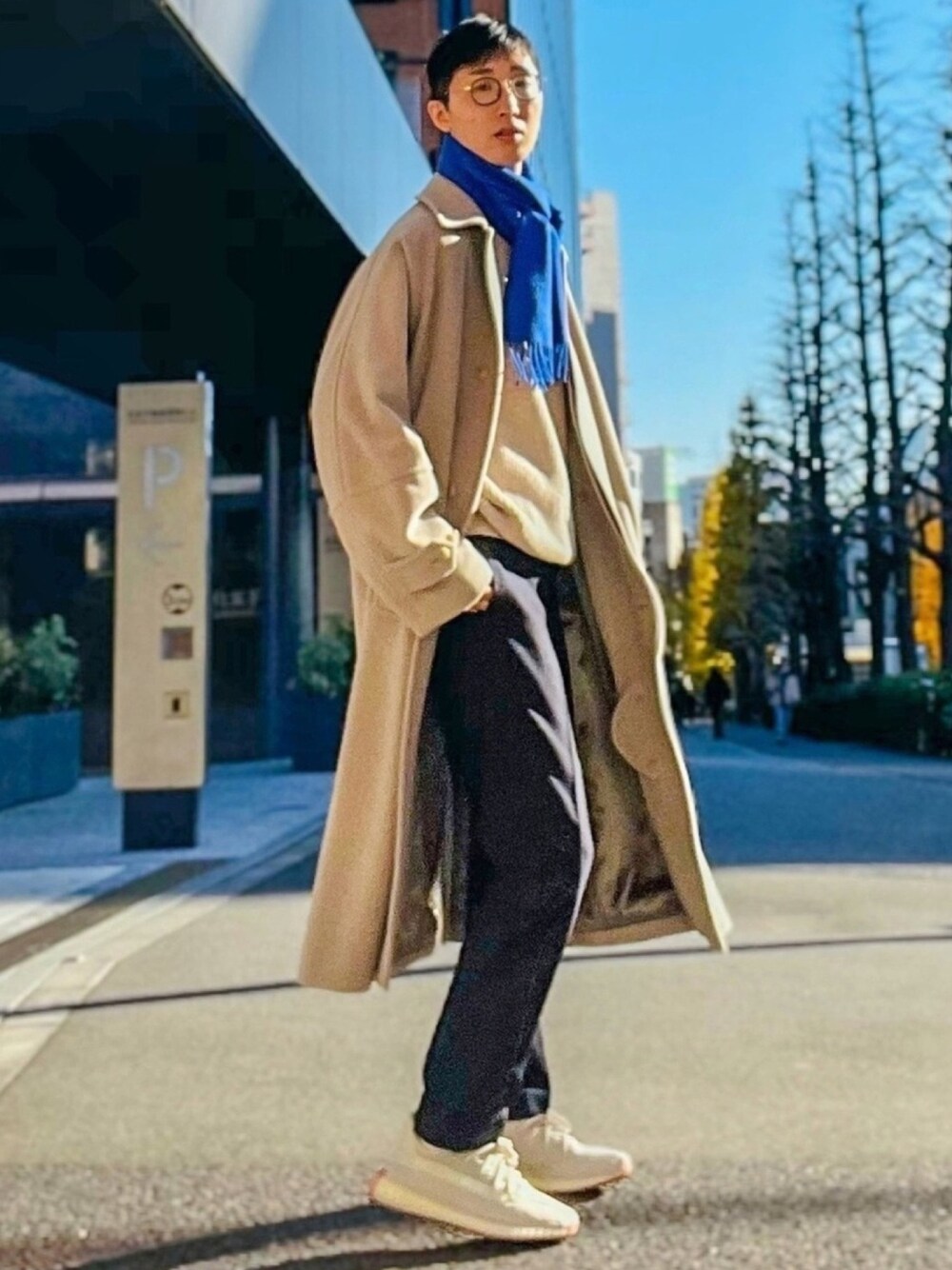 こんにちは! コーディネート良かったらいいね、フォローお気に入りして下さると、とても嬉しいです! Instagramで別パターンも投稿してます!@yan4ken _________________________________________ イノウエブラザーズのマフラー巻いてみました🧣 ニュアンスカラーが増えてるのでこれくらい鮮やかな青も良いですね😊