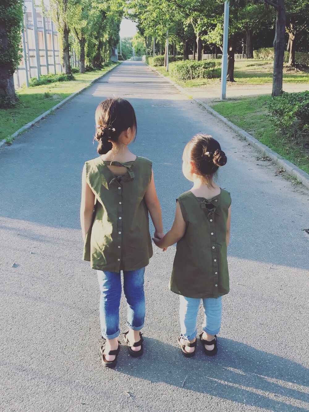 グリーン系のトップスを着用したキッズの夏コーディネートの1枚目の写真