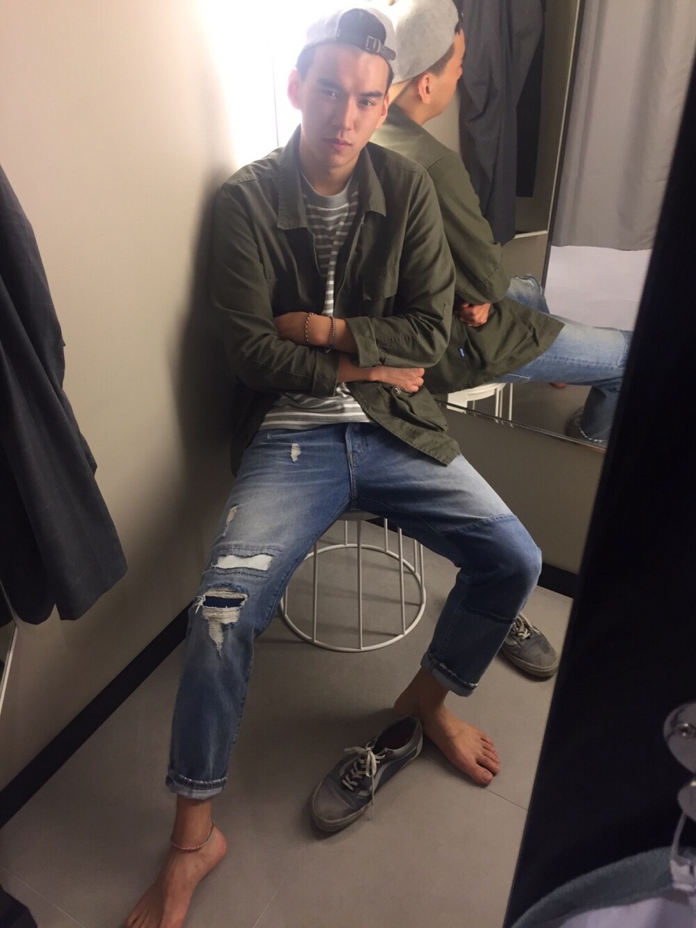 グリーン系のジャケット/アウター、その他のデニムパンツ、グレー系の帽子を着用したメンズの秋コーディネートの1枚目の写真