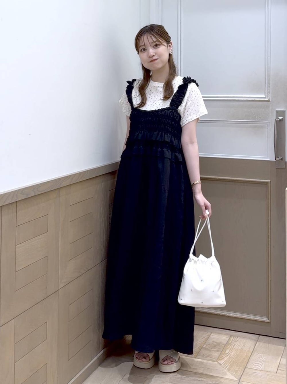 ワンピースは肩のドロスト部分で 丈感を簡単に調整できます☺️ 胸周りはゴムで伸びるので、 締め付け感も気になりにくいです!