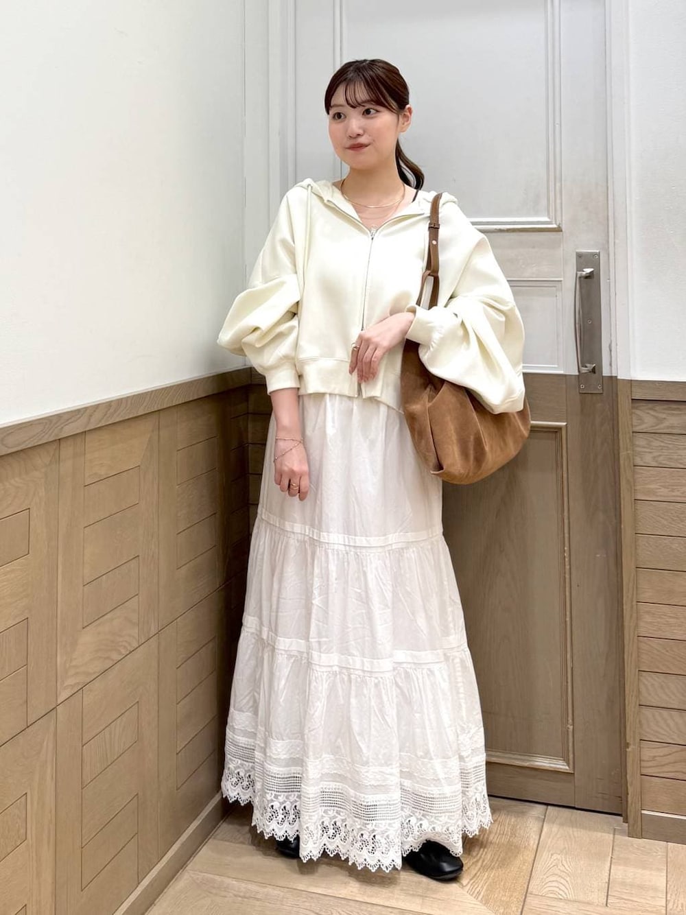春のワントーンコーデ🤍 真っ白なレースデザインがポイントのコーデ♡ 大人気のフーディと合わせて甘くなりすぎない コーデにしてみました!締め色でスウェードの バッグを合わせました☺️ スカートはやや透けるのでペチコートも 一緒に履くのが安心でおすすめです! 身長150cmの私でもウエスト折らずに履けました! Instagramも毎日更新してます🐰 ▶︎