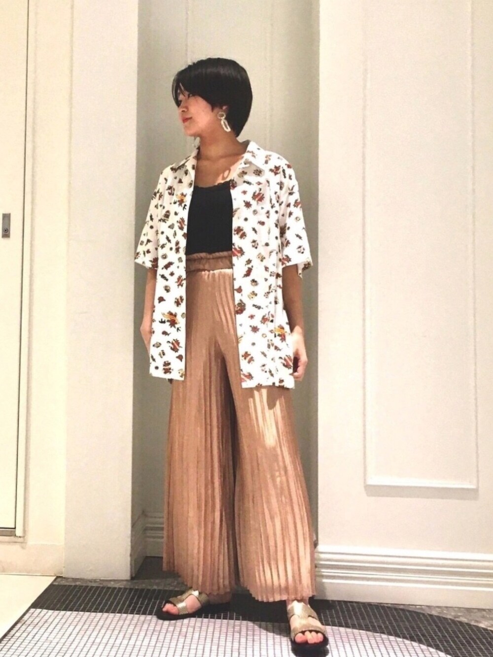 メンズシャツのMサイズを羽織り代わりに。レースタンクトップと光沢感あるプリーツパンツで女らしさもプラス。