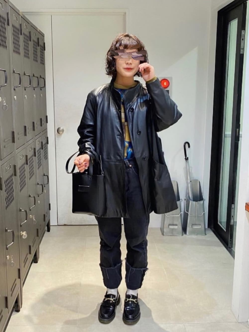 古着のレザージャケットに古着屋で購入したリーバイスの黒デニムを合わせました。デニムは丈長めのものをカットして折り返して履いています(^^)