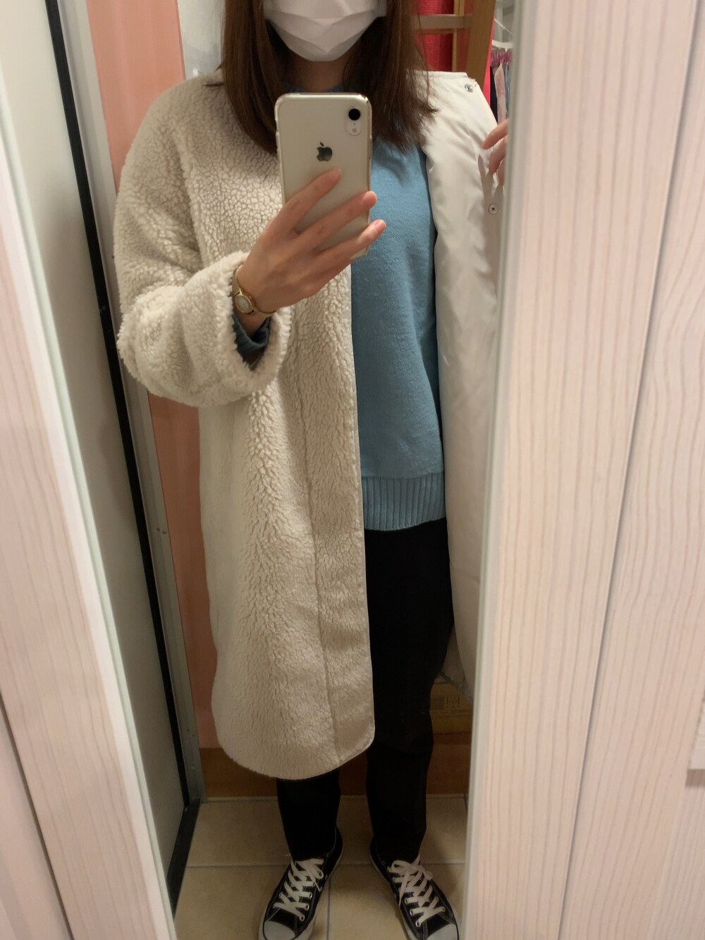 慣れない自撮りで失礼します! いつもご覧いただきありがとうございます♫ ノーカラーのボアコートは軽くて暖かくて大人かわいく着られます。