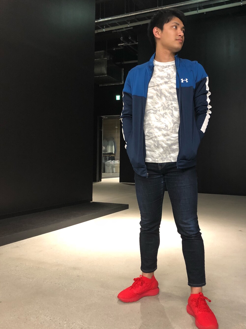足元は赤で明るく このジャケットは 今シーズンハマりそうな予感
