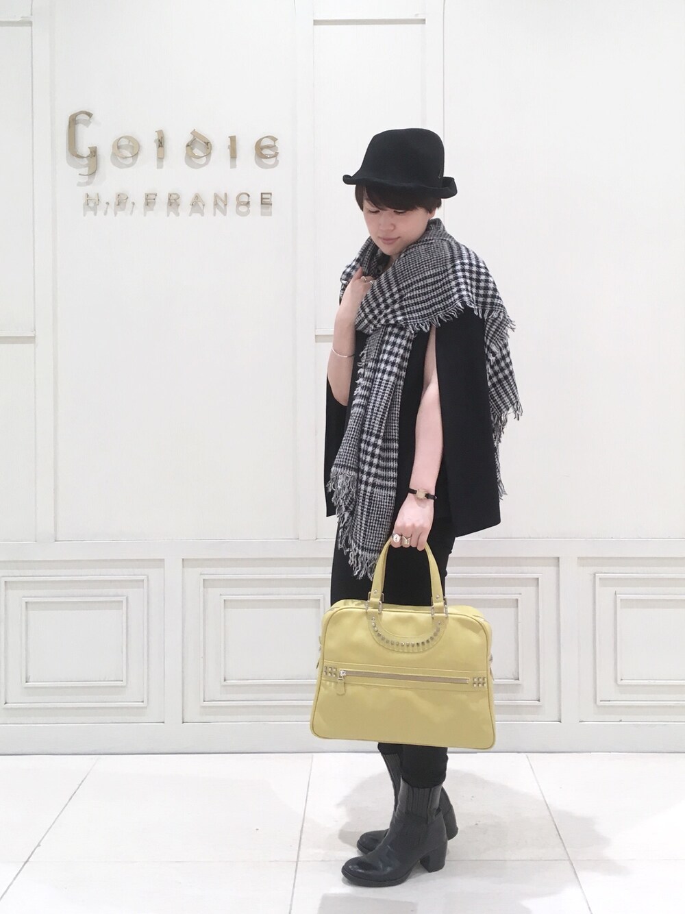 秋冬の小物、もう探していますか?黄色と黒ってなかなか奇抜な取り合わせに見えますが、グレンチェックのストールが良い感じになじませてくれるのでおすすめです。