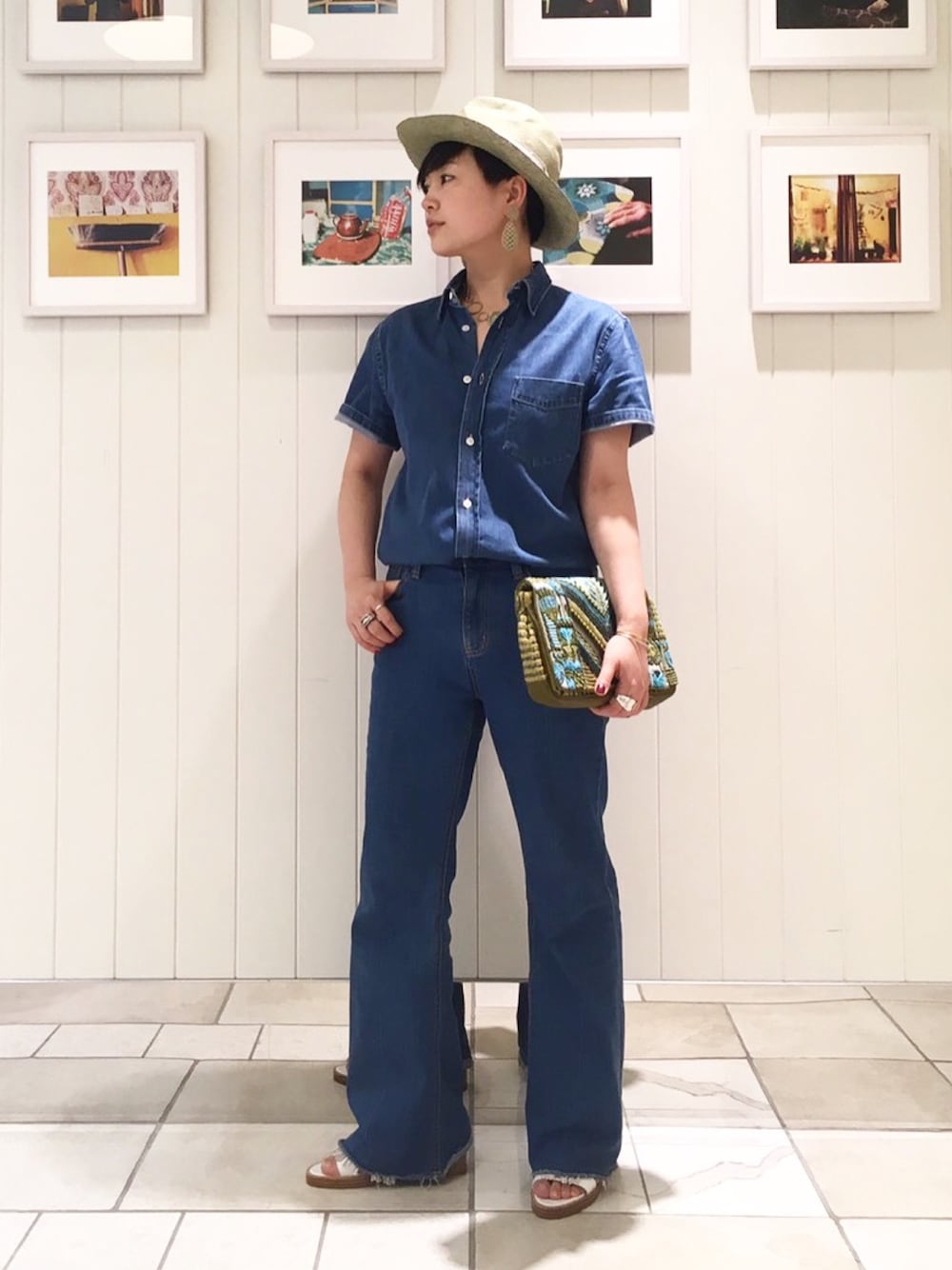 デニムオンデニム。 小物はグリーンでまとめました。 サンダルのフリンジがチラ見えするのがポイントです。