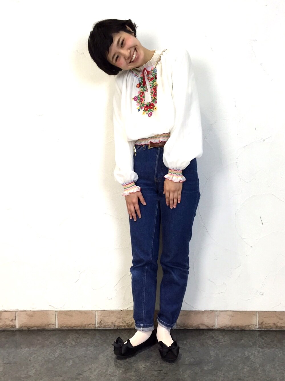 古着のブラウスは、 福岡の大名にあるフランス買い付けのお店で。 刺繍が可愛くって、袖もブリブリの甘さでお気に入りです 可愛すぎるスタイルは苦手なのでデニムで合わせカジュアルダウンしました 足元にバレエシューズを持ってきて、気分は異国の人です🎶🇫🇷 裾をすこーーしだけ折って、気持ちスッキさせました👖