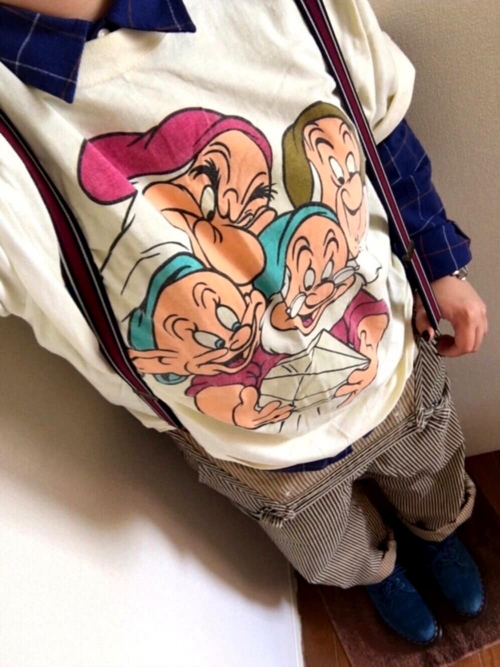 🤢古着コーデ🤢 マーチン以外全て古着です! 古着大好きです◎◎ 古着屋さんで、 全部1点1点メーカー、サイズばらばら な中で自分にピッタリだと思うアイテム に出会うのが幸せです\(^ω^)/ 今日の7人の小人Tは 光を吸収して暗闇で光る仕様です★ 家で気付きました。