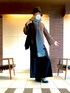 トップスは裏起毛のスウェッティ。暖かくしつつ、シルエットはフェミニンにできます。スカンツを合わせれば秋冬ジェンダーレスコーデに!UNIQLOの2024ストールがまたすごく合わせやすいです。