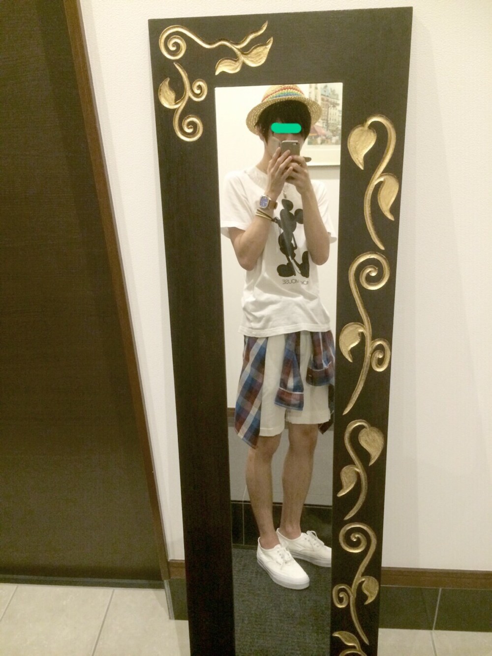 全体的に白っぽいので腰にシャツを巻きました^^ クツは紙が貼り付けてある加工?の不思議なオーセンティックでした!