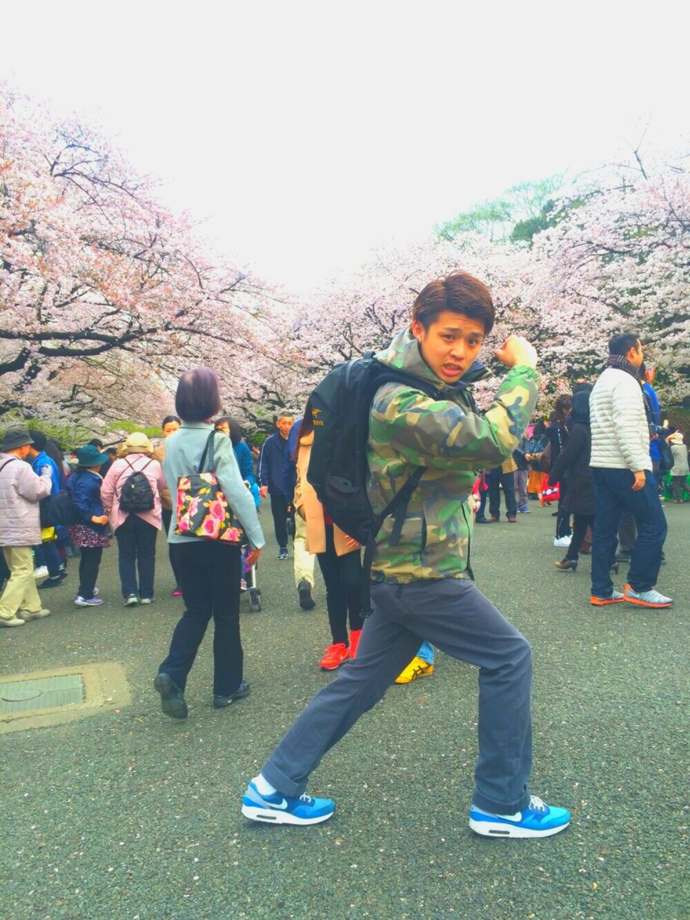 今日はすこし寒いですね。服はMサイズ、アメリカサイズならSサイズ。 ティピカルジャパニーズ体型のゴリラ先生。 We call it "Japanese cherry blossom viewing". Almost all people don't see it, they are drinking and having a patty outside though. That's a contradiction.