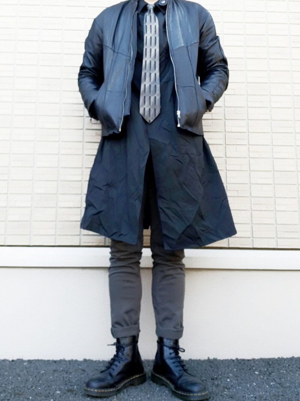 やけに長いシャツですね? ステンカラーコートにネクタイしてます ライダース着る順番間違えてますよね? コートの上でいいんです 中にライダース着るのとは全然違う印象になりますね。ギャルソン男子的な。お試しあれ!