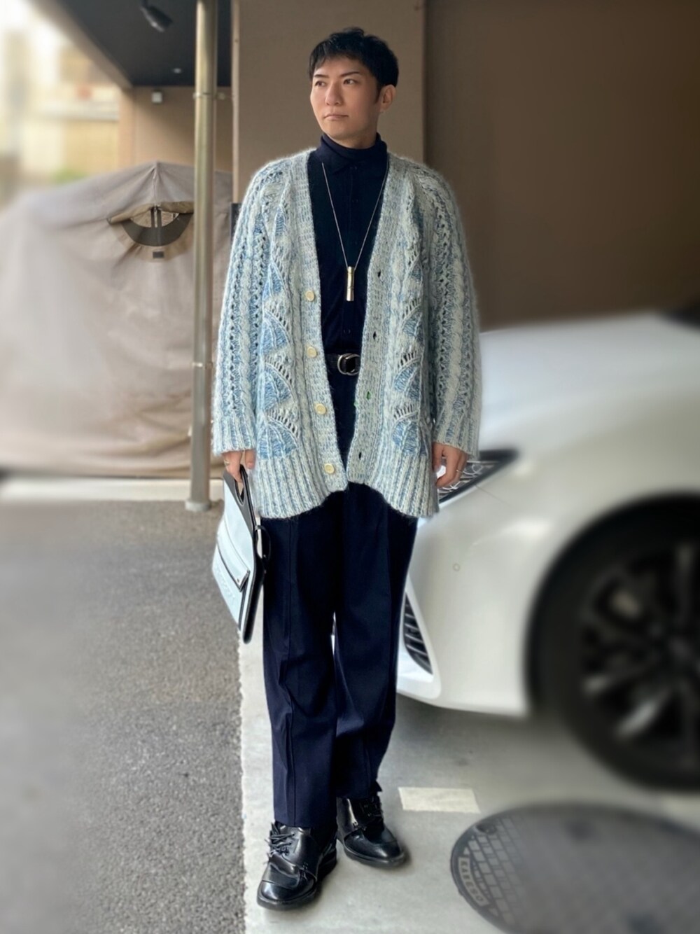今日はブルーコーデでまとめました! 暖かめだったので、少し薄着です。 主役は淡いブルーのカーディガン。 オーバーサイズで丈も長めなのでYラインシルエットを意識しました。 インナーシャツもスラックスも濃いめのネイビーで一体感を。 バッグは、カーディガンと色を合わせつつ随所に黒レザーが入って引き締め、靴も黒レザーでまとまりを出してみました! 今から全身鍼急に行ってきます!