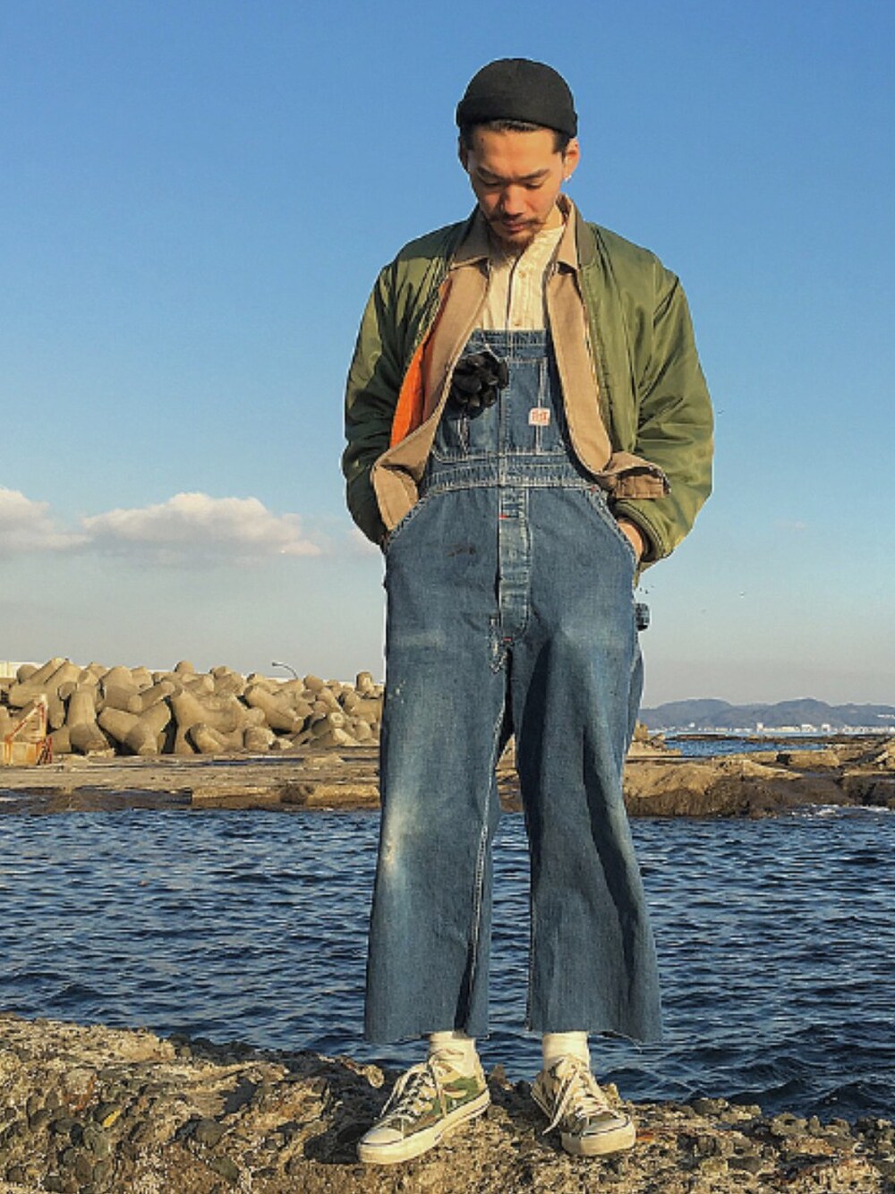 江ノ島にて🌊 冬の海もいいもんです😎 ワーク×ミリタリーな感じ🌿 USAカモのコンバースはデカ履きで!◯