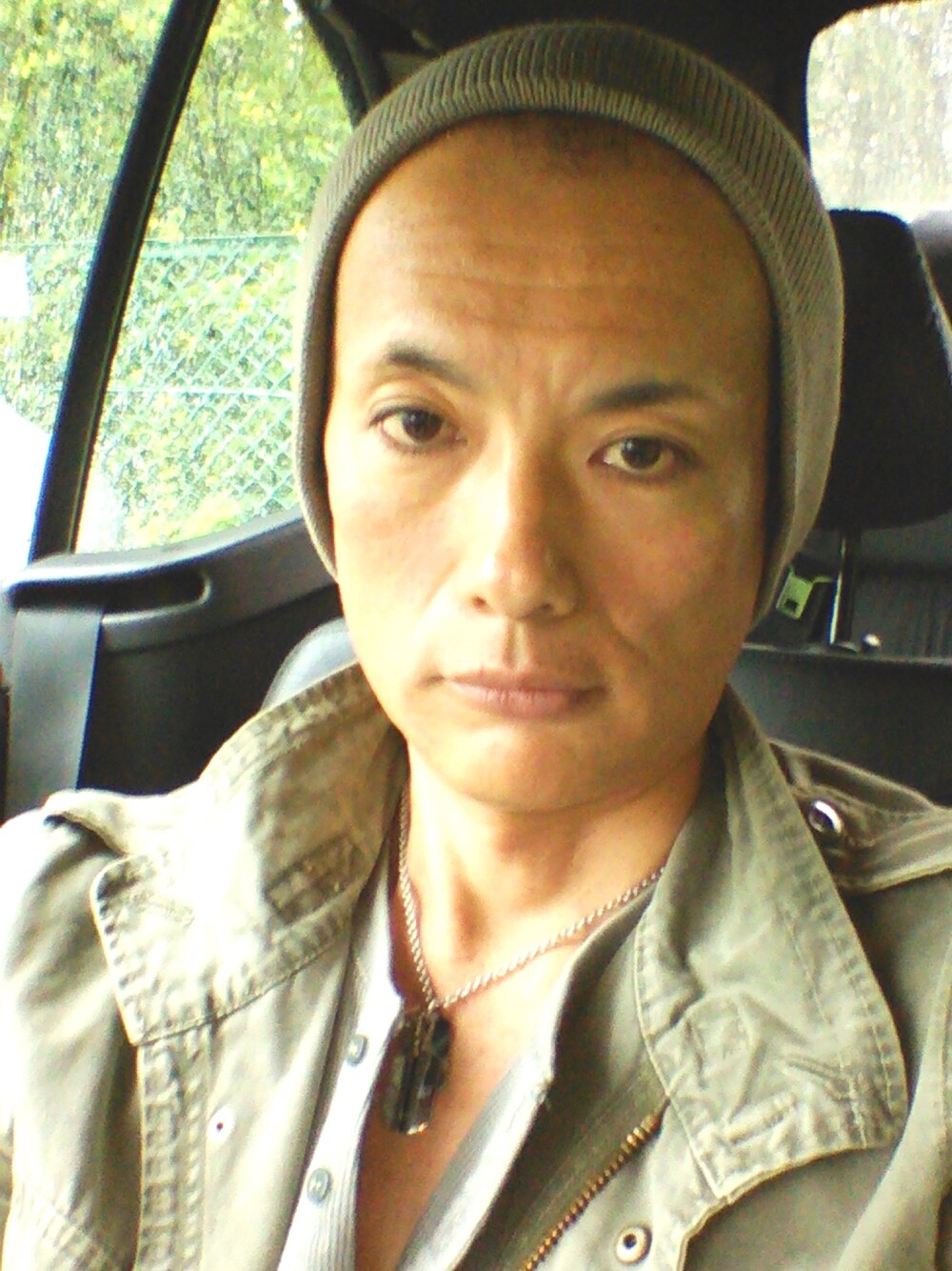 ジムに行く前に車の中で。 温かくなって来たので軽装です。