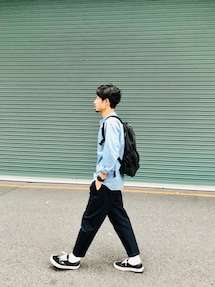 yasuのシャツ/ブラウス「綿麻ストレッチシアサッカーバンドカラー7分シャツ」を使ったコーディネート