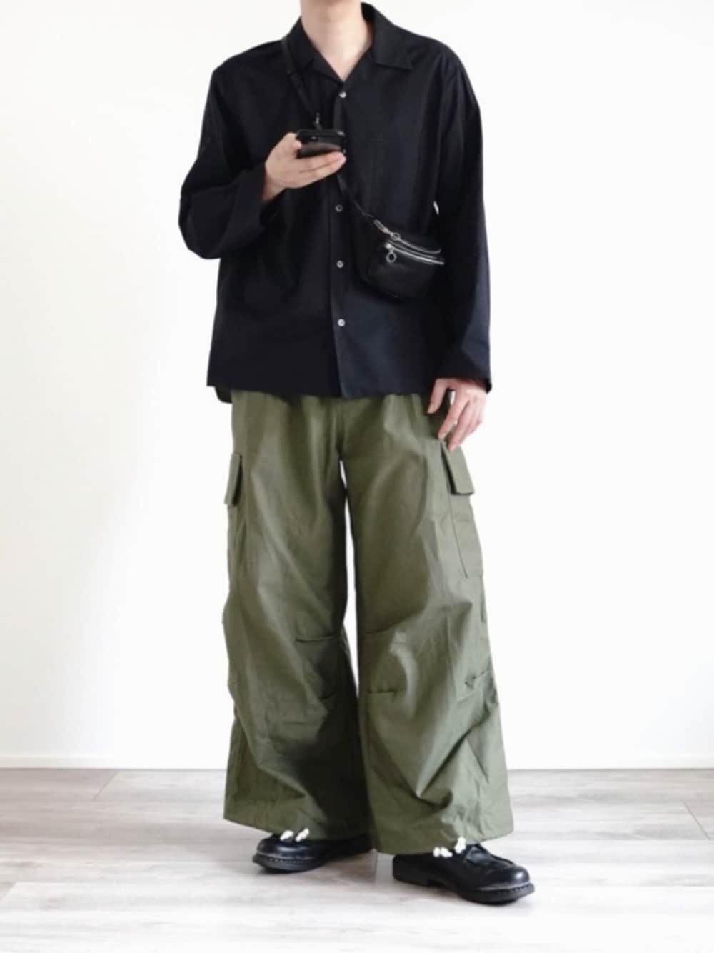 ご覧いただきありがとうございます。 綺麗めとカジュアル要素をバランスよくとれた大人カジュアルスタイル。 丈感の短めなシャツなんでワイドフレアなシルエットのパンツとの相性が良くて、足が長く見えます。 グリーンの色味がブラックで綺麗に引き締められた大人スタイルです。 ________________________________________ ▷ yasu.24kr こちらでも自分なりのファッションを発信してますので 是非こちらもチェックしてみて下さい。