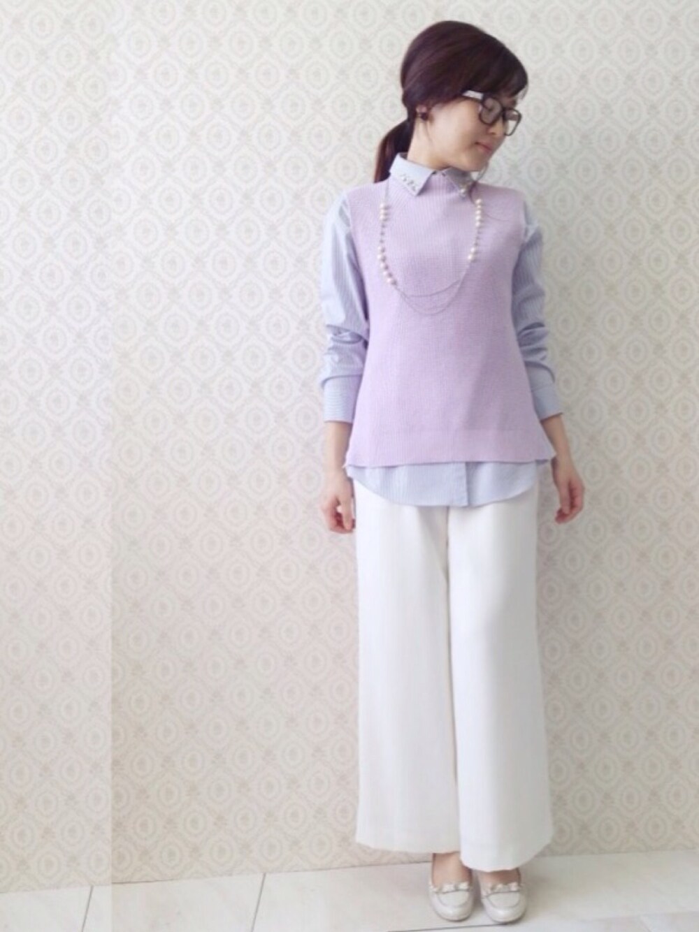 春色がワクワク気分を盛り上げてくれるニットベスト。 襟にビジューのついた華やかシャツブラウスとのレイヤードで。 ラベンダー×ブルーの配色も新鮮♡ ▷▷2/10 ZOZOTOWNにRose Tiara OPEN◁◁