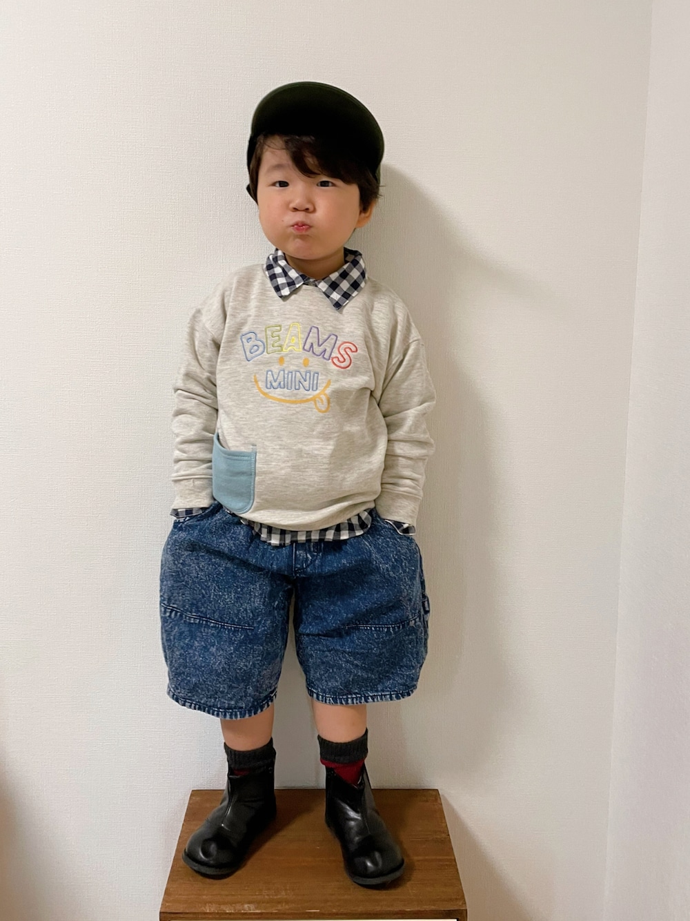 見ていただきありがとうございます🌷.* スマイルスウェット着回しです☺︎ ☞BEAMS miniさま スマイルスウェットプルオーバー(90-130cm) りー👦🏻100cm/120オフホワイト着用. ギンガムとも合う〜🐼