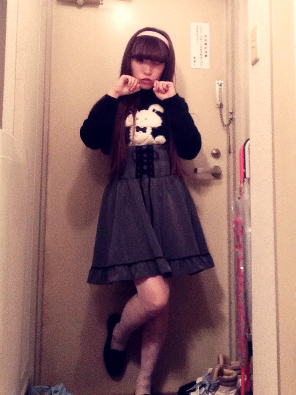 GoodGirlなコーディネート💘 寒くなってくると黒も着たくなります! しかし暗くなりすぎないようにグレーのボトムにしたり、アクセサリーやレッグウェアにピンクを取り入れたりするのがポイント💟 うさぎちゃんのニットは去年のCandyStripperのもの🐰 ぼちぼち公開し始めている新作も絶対可愛いのでまた予約をしに行きます💨