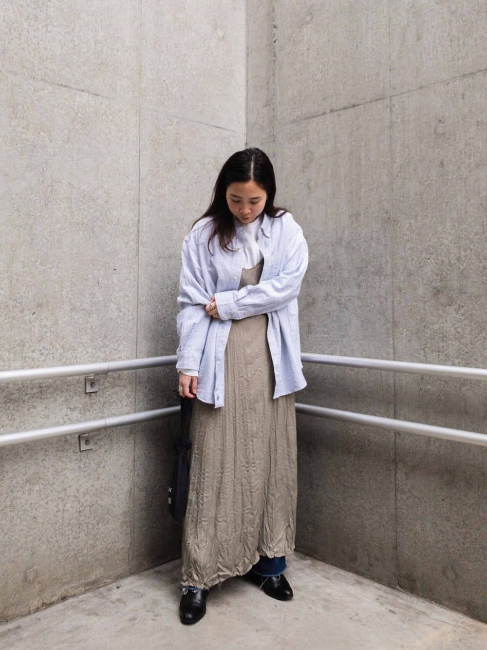 あえてオーバーサイズをチョイスしてワンピースとレイヤードしました! オーバーサイズのシャツは羽織りとしても使えるし、ヌケ感も出て◎