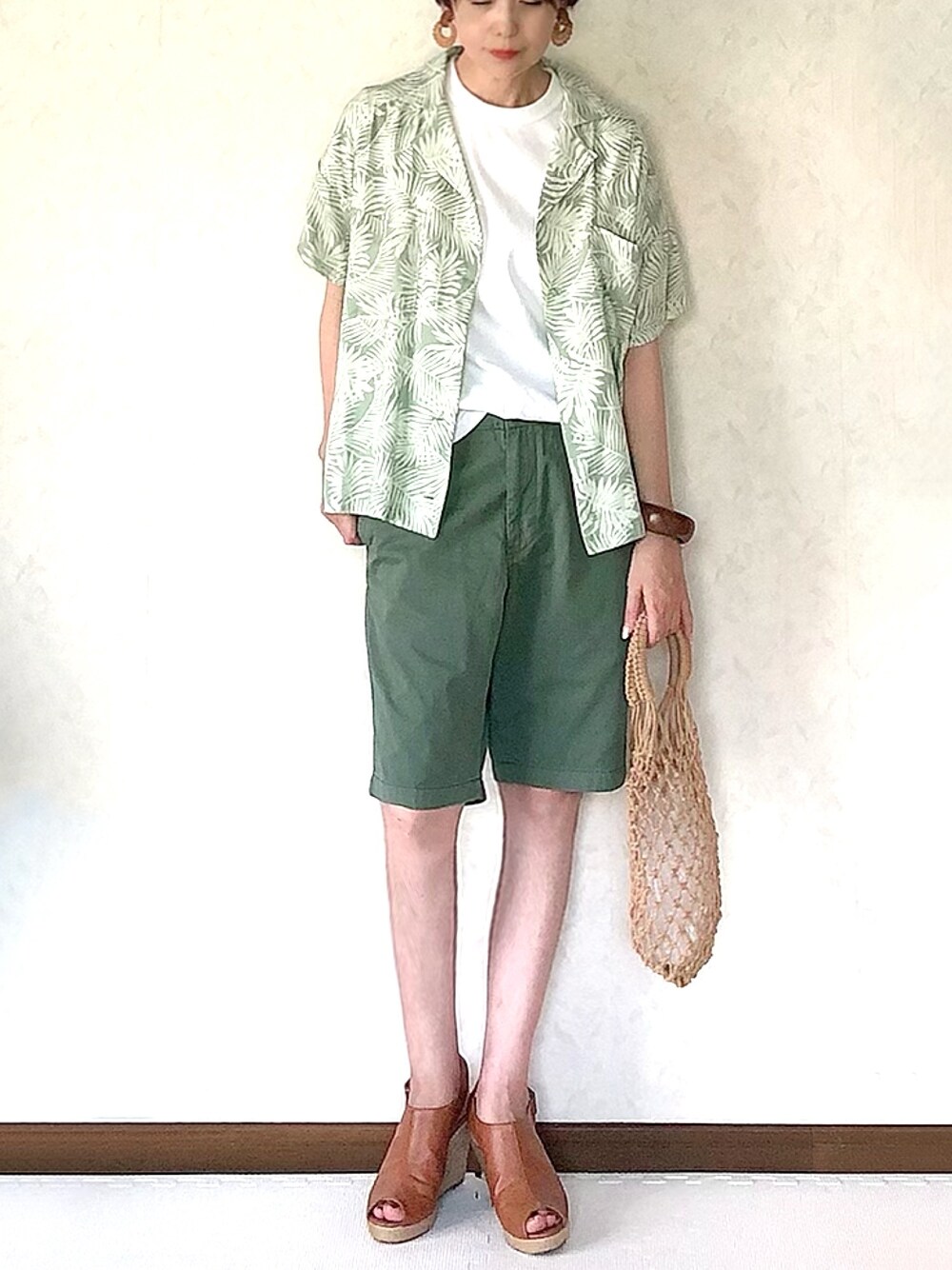 リーフ柄シャツを羽織りに☺︎ ショーパンは、ユニクロメンズです。