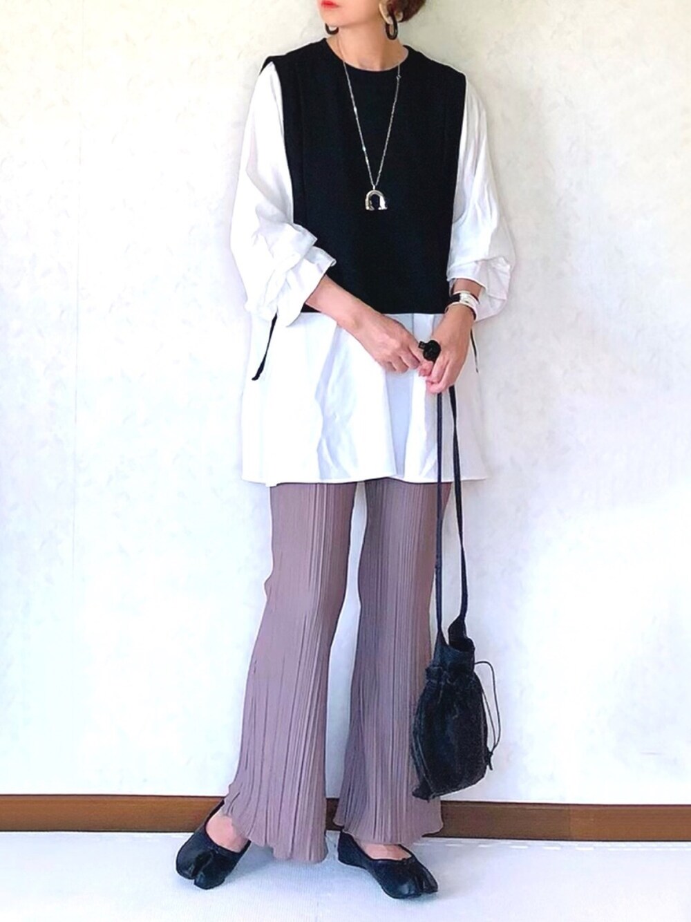 上下しまむらコーデ☺︎ トップスは、ブラウスとベストがドッキング。1枚で、トレンドコーデが完成する優秀アイテムです。