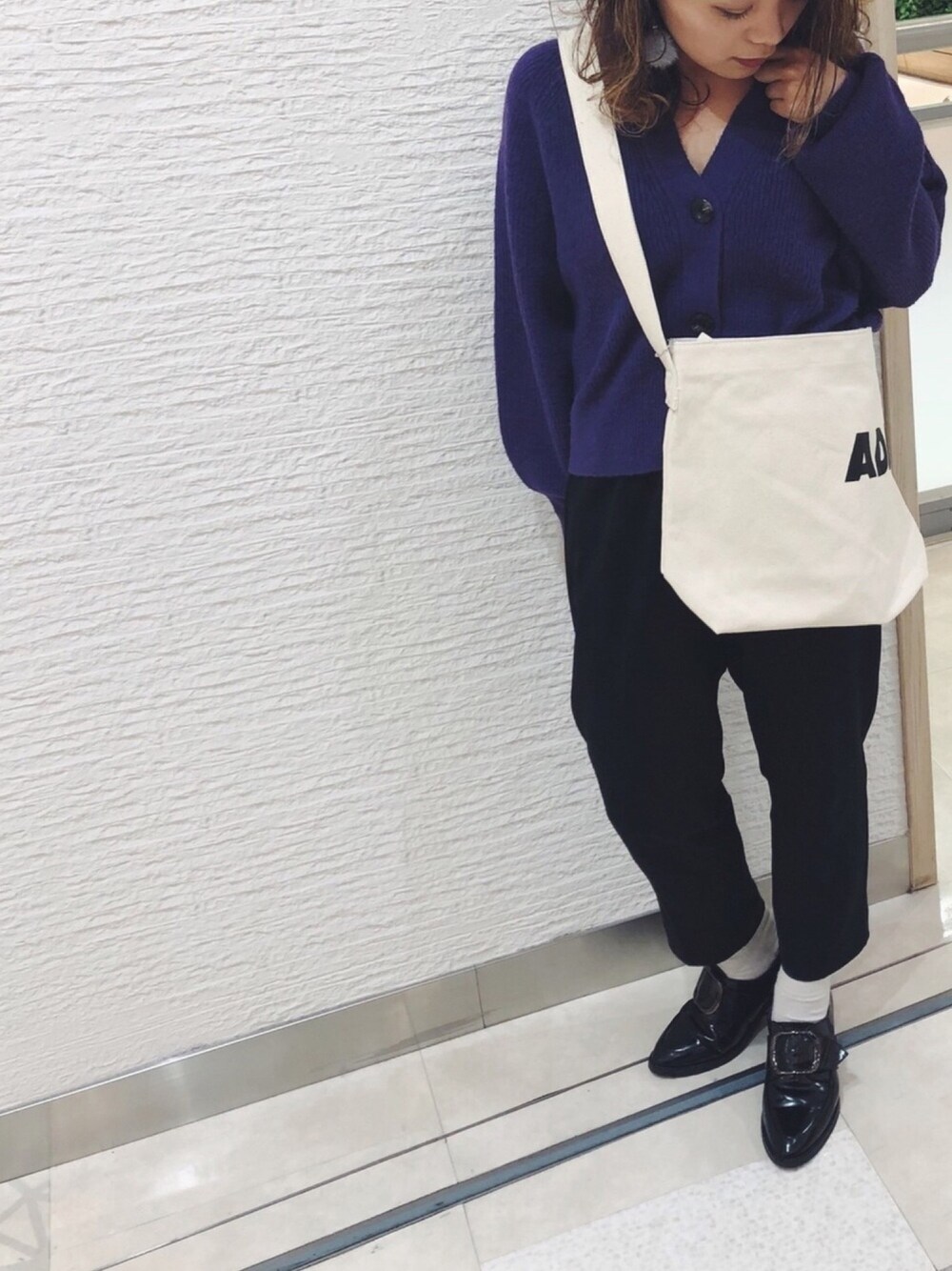 パープルのカーディガンがとっても使える‼︎ 夏が終わってからモノトーンの服が落ち着くんですがそれにトレンドのパープルを足すとかなりオシャレで最近パープルに頼りすぎてます。 ボタンも大きめでスカートに合わせるとまた違って可愛いんですよ😍 今年はカラーニットたくさん入荷しているので目が離せないです✨✨ ちなみに最近のお気に入りはこのADAM PATEKロゴのショルダートート!! 何にでも合わせやすいのでオススメ💕