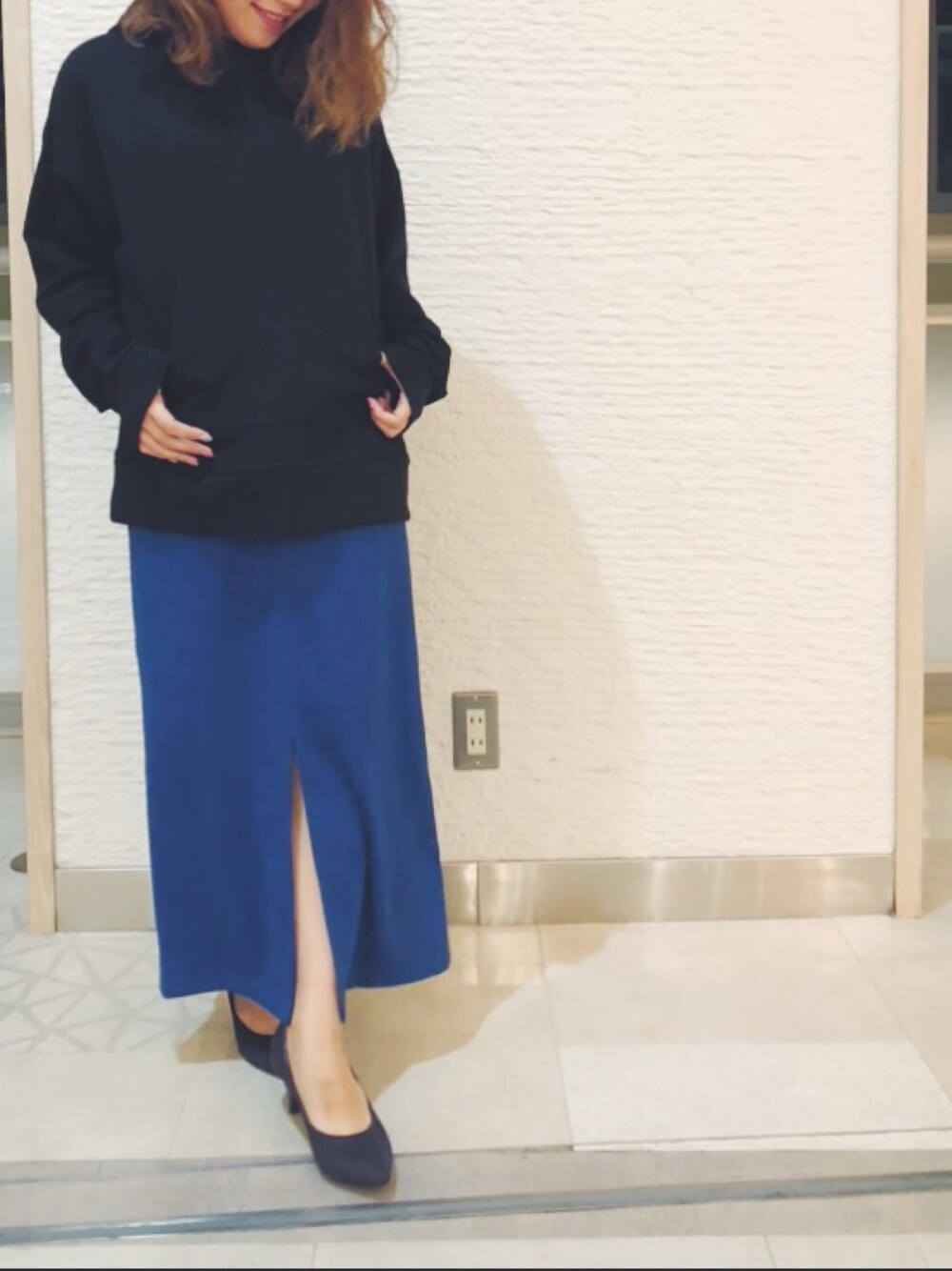 ブラック×ブルーの組み合わせが最高✨ ブルーの色が本当に綺麗でこれは一目惚れしました😍 他の色も発色◎ 前スリットなので歩いた時にチラッとでる感じがとっても可愛い!! パーカーもスリットがついているのでオーバーサイズでも横がすっきり見える形です😆