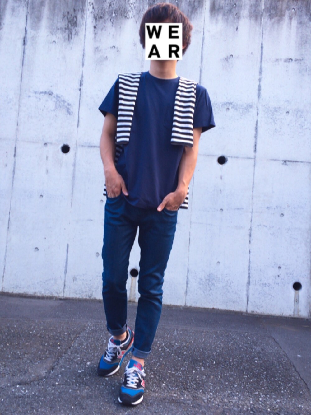 こんにちは! 今日はネイビーのワントーンにポイントとしてボーダーTシャツを肩掛けしてみました! 夏のマリンなイメージです🐬 ではでは!