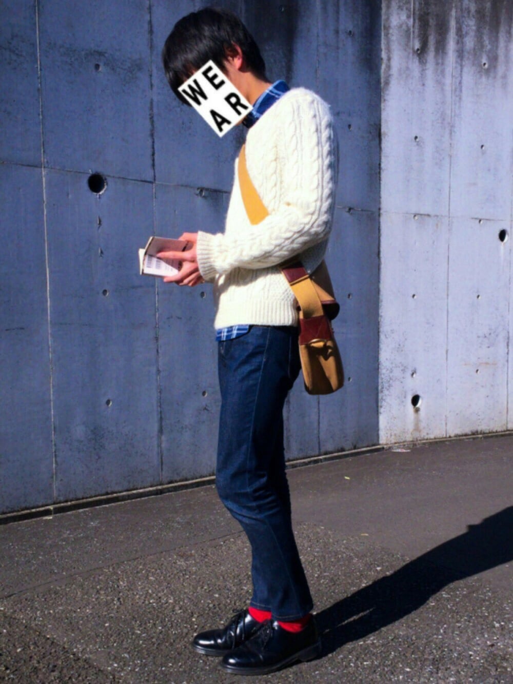 こんにちは! 雑誌で見たチェックシャツとケーブルニットセーターのレイヤードがなんともかわいいなって思ったのでやってみました〜! 本なんか持ってたらインテリっぽいですね👓✨ ではでは!
