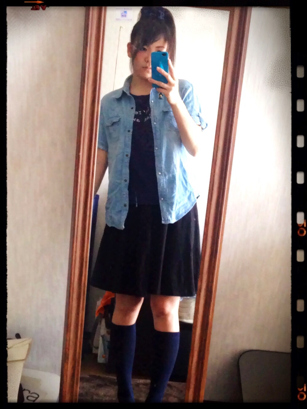 ハイソックスにて。若くなろう、スタイル。笑 ラフなスカートに、ポニーテールとハイソックス。