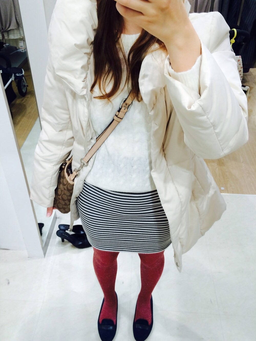 赤のラメ入りタイツが 今日のポイント(*ˊᵕˋ*)♡ クリスマスまであと少し\( ˆ ˆ )/ 今日はアウトレットで お買い物◡̈*