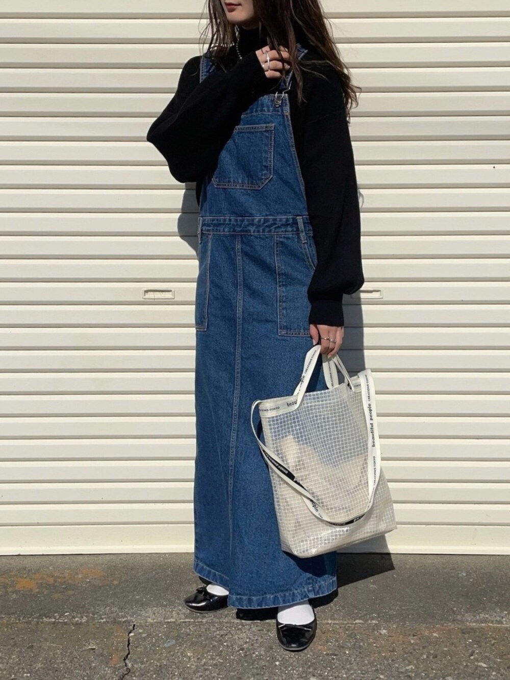 久々のデニムのジャンパースカート 子供っぽくならないように 黒のニットとバレエシューズ合わせ🖤 Instagram👉y__m930