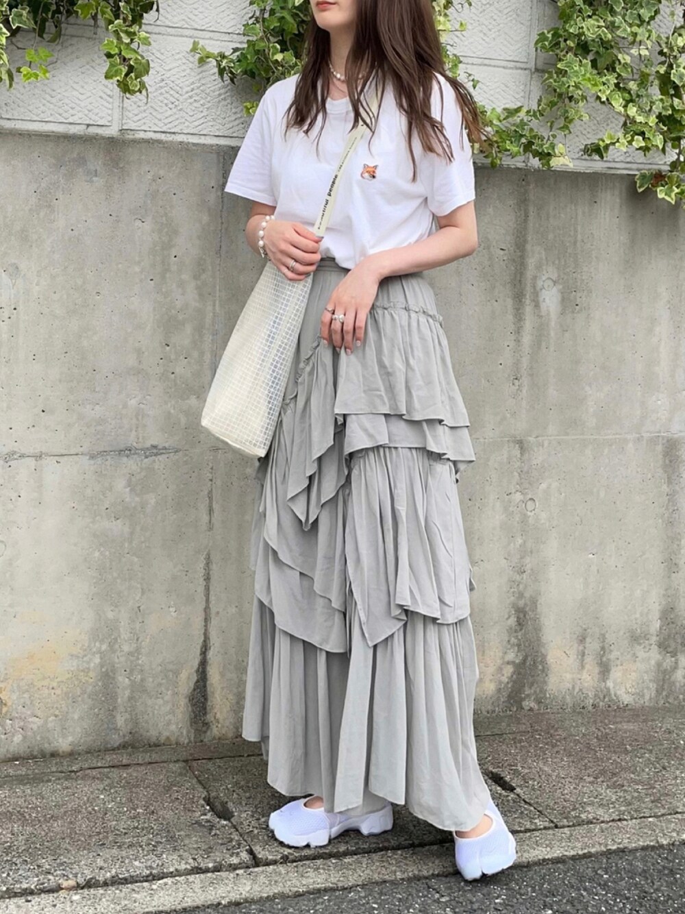 フェミニンなスカートにカジュアル外し✨ エアリフトはこの夏一番使っているスニーカー! Instagram👉y__m930