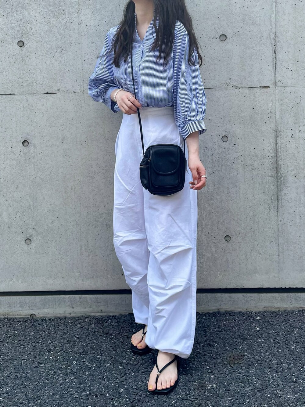 ストライプシャツにカジュアルなナイロンパンツを合わせた旬のコーデ🫐🤍 Instagram👉y__m930