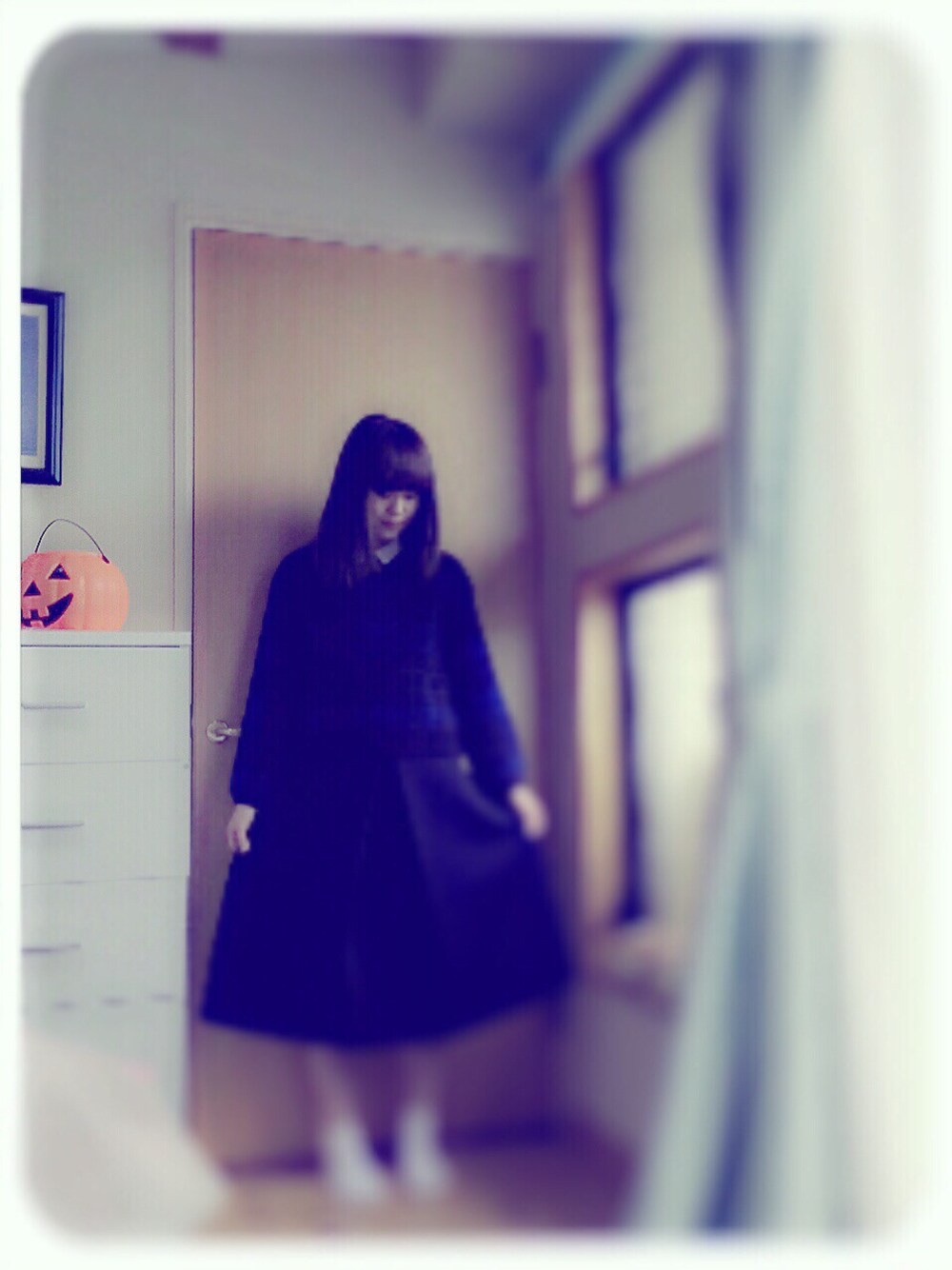 ブラック系のスカートを着用したレディースの秋コーディネートの1枚目の写真