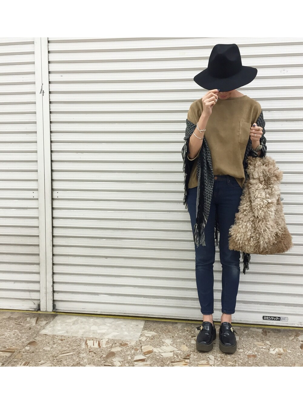 エコスエードのトップスやフリンジをポイントに大人フォークロア。難しい茶系は黒と合わせるとしっくりきます。