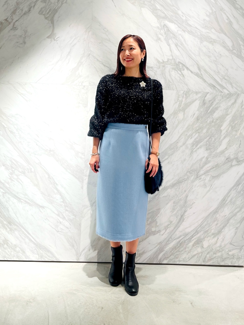 年末年始のお出かけシーンやお食事にもピッタリのコーディネートです。 ・フィルムモールVネック2WAY カーディガン フィルムモールはお食事の場や、パーティーにも活躍しそうなゴージャスで上品な素材です。 モール糸にありがちな糸抜けも少なく、華やかな光を放つフィルムが魅力的。ちくちく感も感じません。ボタンを後ろにして、背中を見せたプルオーバーとして着用しました。 ・ウールプリペラタイトスカート 生地の表面感を活かして、シンプルなタイトシルエットになるスカートです。 春先まで活躍する爽やかなカラーリングです。 裾はフリンジ仕立てで華やかな印象になります。