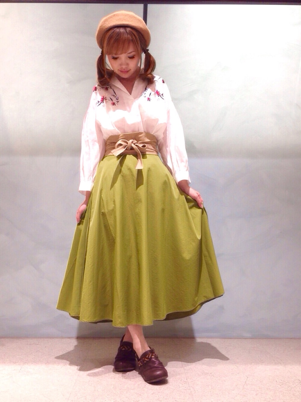 ピスタチオ色のスカート履いてみた💚 刺繍ブラウスinしてサッシュベルトして。。。 以上、新作のご紹介でした! 気分転換に夜は花火してきまーす👘🎇 今日もありがとうです(*´︶`*)♡