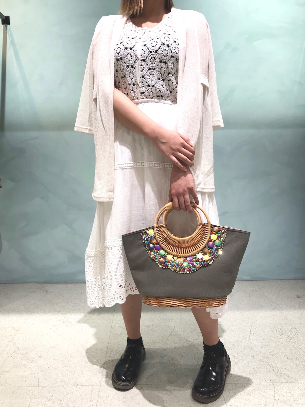 着心地抜群のレースワンピに 透け感のある涼しい麻混カーデ合わせ。 白コーデの差し色にビジューBAGが可愛いです˚⁎⁺˳✧༚ 今回のモデルは長身のH香さん♡