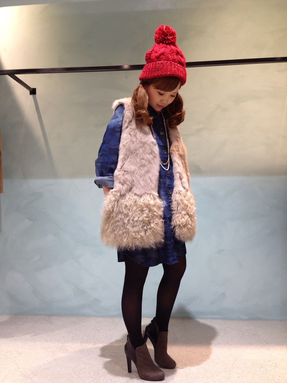 今日は迷彩柄のデニムワンピース♡ 今の時期に丁度良い羽織りにもなりますよ(o^^o)♪ ここ何日かお店で一際目立ってるラビット×羊のファーベストを羽織ってみました(≧◡≦) スウェード×牛革のブーティですが、 久しぶりに10センチヒールを履いたので、若干コケそうになりながら立っております(^_^;