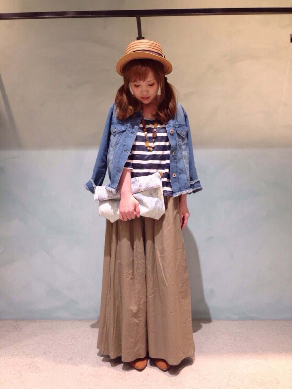 やっと舞い戻って参りましたー*˙︶˙*)ノ"♡ 皆様お元気ですか?? 熊本県や九州地方在住の皆様のご無事と、1日でも早く元通りの生活が戻る事を心より願ってます。 同じ日本なのに、 ちっぽけな国なのに、 私の住んでる所はなんともなくて、 変わりない毎日が進んでて、 すごい距離を感じてしまうし、 戸惑う気持ちでいっぱいです。 少しでもチカラになれるように募金集めます! レジに募金箱置いてるので仲が良いお客様には呼びかけて⋆。˚✩ もちろん私も精一杯のキモチを入れさせて頂きました♡ 募金箱いっぱいにお金が集まるといいな~ なんて思う事しか出来ませんが、 私なりに頑張ってみます!! それでは今日のコーデですが、 シースルーボーダーのレイヤードチュニックに カーキのマキシ丈スカートを合わせました✩⃛ೄ パンツに見えますがスカートですよー(^_^; デニムJKを肩がけして キャメルのレースアップパンプス履いて♥︎∗*゚ パンプス、レースアップのとこ見えてませんがOKという事で\(❁´∀`❁)ノ 後、コレが入荷した時からずーっと気になってるんですが、、、 バンダナ柄とデニムがmixされたクラッチ\ ♪♪ / 今日も見て下さってありがとうございました❤